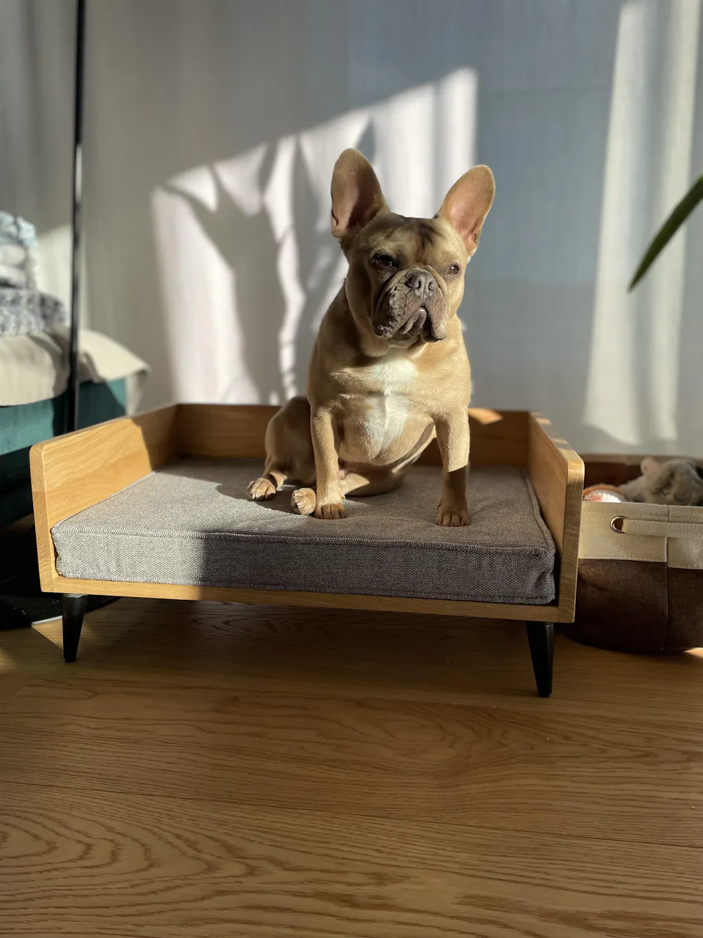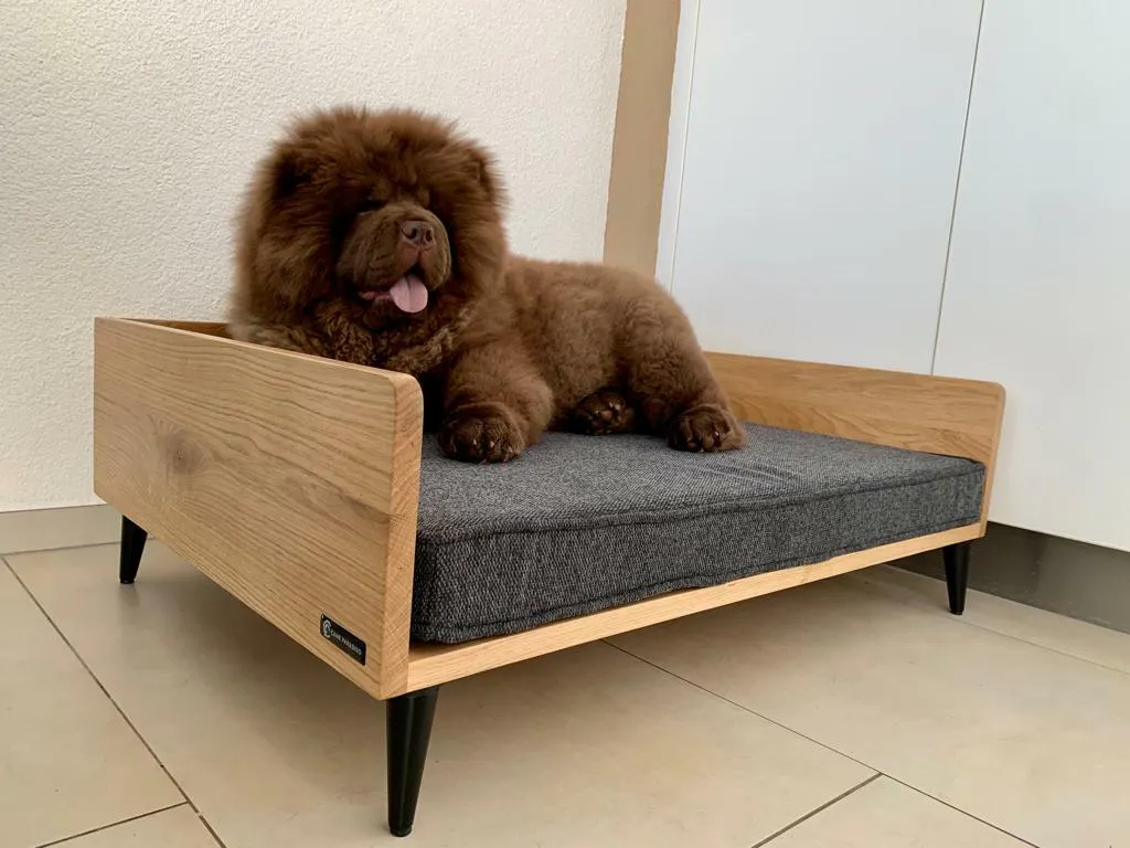 Ein echter Blickfang in jedem Raum, welcher sich nahtlos in jede Einrichtung einfügt. Konfigurieren Sie Ihr einzigartiges Hundebett nach Ihrem Geschmack (Holzart, Grösse, Möbelfüsse und Stoffbezug wählbar).